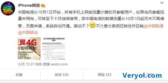 在國家政策的多番敲擊下,中國電信有所響應(yīng),今天網(wǎng)上出現(xiàn)了一個(gè)鼓舞人心的消息,微博@iPhone頻道表示:“中國電信從10月1日開始,所有手機(jī)上網(wǎng)按流量計(jì)費(fèi)的月套餐用戶,如果當(dāng)月套餐流量未用完,可轉(zhuǎn)至下個(gè)月繼續(xù)使用,即中國電信的數(shù)據(jù)流量從10月1日起月末不再清零,無需申請,系統(tǒng)自動(dòng)開通。”并附上兩張圖,其中一張貌似就是中國電信內(nèi)部的實(shí)施方案通知。此消息一發(fā),網(wǎng)友們立馬奔走相告,一時(shí)間就登頂熱門微博。可見大家的心情有多激動(dòng)了,有不少網(wǎng)友表示:已做好投入電信懷抱的準(zhǔn)備!