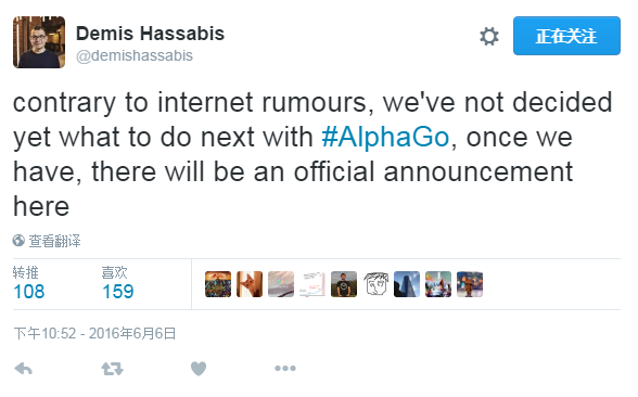 但現實總是出現意外,就在棋迷們為這場即將到來的比賽興奮不已時,“阿爾法狗之父”哈薩比斯卻于昨日在社交平臺回應稱,這些不過都是網上的傳言,阿爾法狗暫時沒有比賽計劃,一旦有的話,會有官方的通知。