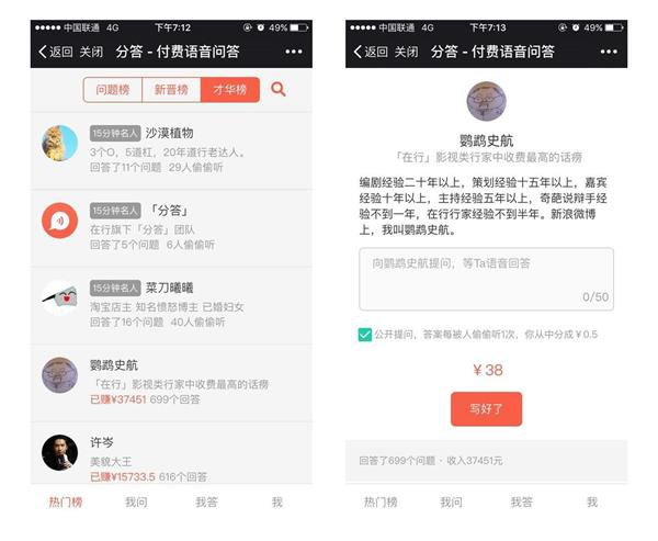 與值乎相比,在分答你更能看到大咖們隱秘在鏡頭背后的多重身份,也能聽到他們不被世俗價值觀要挾的聲音,而很多大咖的角色也將由大眾娛樂化轉向知識型網紅,每個人在分答的轉型都令人期待。并且分知乎大V們都早已入駐分答,走在知識共享經濟浪潮的前列,分答也預先完成了對知識網紅科學篩選,這幾點都將成為值乎發展的束縛。